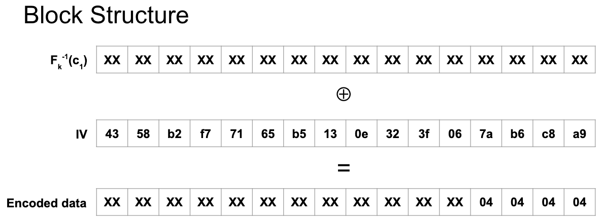 XXXXXXXXXXXXXXXXXXXXXXXX04040404Remember what we mentioned about the CBC security notion: “if as much as a single bit about decrypted ciphertext is leaked, the adversary can learn the entire plaintext message”. In our case, we may have just forced 32 bits to leak since we know the four bytes of padding must be 0x04040404.